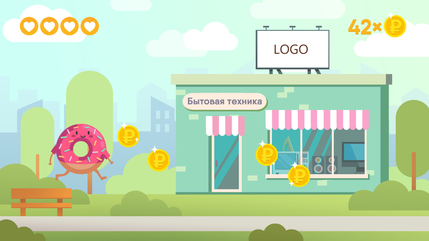 Endless race with obstacles. Each completed step gives you points, and the number of points you earn can be converted into coupons, promo codes, points, etc.
